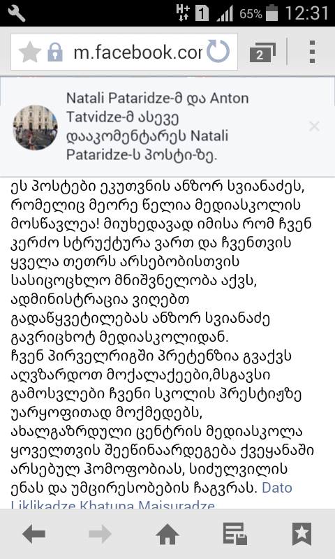 რაც შეეხება იმ ფაქტს, რომ სოციალურ ქსელში ნატალი პატარიძის პოსტს ანზორ სვიანიძის მიმართ უარყოფითი კომენტარები და შეურაცხყოფა მოჰყვა, დირექტორი ამბობს, რომ სწორედ ამიტომ მან აღნიშნული პოსტი facebook-იდან წაშალა.