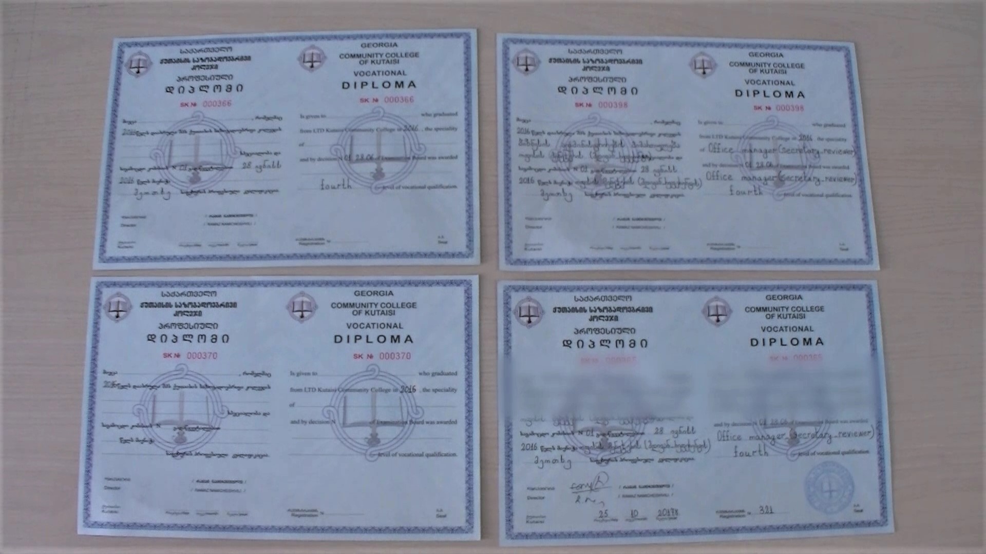 ხოლო მეორე შემთხვევაში, იმერეთის რეგიონში არსებული სასწავლო დაწესებულების ხელმძღვანელმა დაამზადა და 1 800 ლარად გაასაღა ოფისმენეჯერის სპეციალობის პროფესიული განათლების დამადასტურებელი ყალბი დიპლომი.
