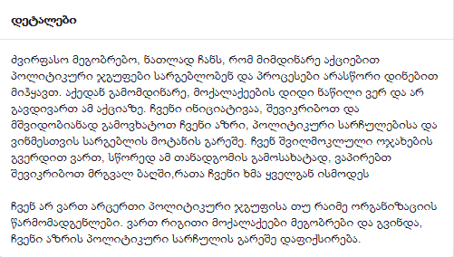 ჩვენ არ ვართ არცერთი პოლიტიკური ჯგუფისა თუ რაიმე ორგანიზაციის წარმომადგენლები. ვართ რიგითი მოქალაქეები მეგობრები და გვინდა, ჩვენი აზრის პოლიტიკური სარჩულის გარეშე დაფიქსირება” – ნათქვამია განცხადებაში.