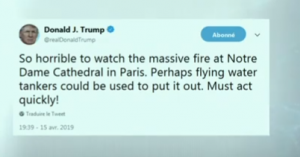 “საშინელი სანახავია ცეცხლმოკიდებული პარიზის ღვთისმშობლის ტაძარი, ალბათ მფრინავი წყლის ტანკერების გამოყენებაა შესაძლებელი ჩასაქრობად. აუცილებელია უსწრაფესი მოქმედება”, – წერს ტრამპი.