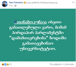 ზუგდიდის საკრებულოს თავმჯდომარის მოადგილემ თაზო ფაცაციამ მრავალი დაპირების შემდეგ “მეტრონომს” განუცხადა, რომ 5 წუთში გასცემდა მის ფეისბუქ პოსტზე პასუხს, რომელიც პარლამენტარ თინა ბოკუჩავას მიმართ დისკრიმინაციას შეიცავდა.