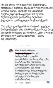 “ჰო აბა, პირდაპირ თვალში დაუმიზნა, რა უნდოდა, შტურმით რატომ იღებდა პარლამენტს, ასე რომ სამწუხაროდ ზოგს თვალში მოხვდება, ზოგს ტ***ში,”- წერს ქუთაისის მერიის მაჩალჩინოსანი სოციალურ ქსელში.