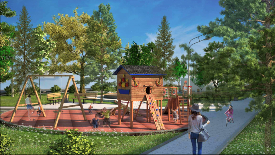 პროექტის ფარგლებში, მოეწყო სარწყავი სისტემა და ბორდიური. ამ ეტაპზე, ტერიტორიის ფილებით მოპირკეთება მიმდინარეობს. ასევე, შესრულდება გამწვანების სამუშაოები, მოეწყობა საპარკე ინფრასტრუქტურა და კაუჩუკის მოედანი, სადაც დამონტაჟდება საბავშვო ატრაქციონები.