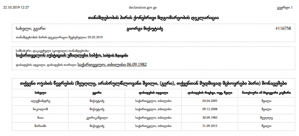 “მეტრონომი” გთავაზობთ საქართველოს იუსტიციის უმაღლესი საბჭოს მდივანის, უზენაესი სასამართლოს მოსამართლეობის კანდიდატის გიორგი მიქაუტაძის ქონებრივ დეკლარაციას.