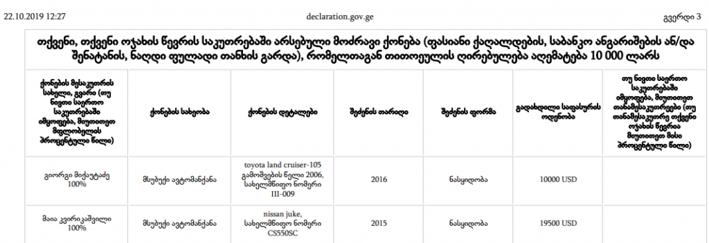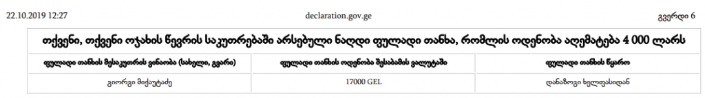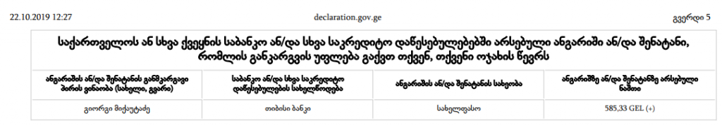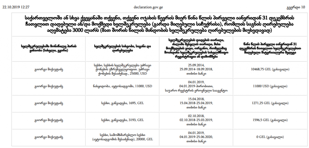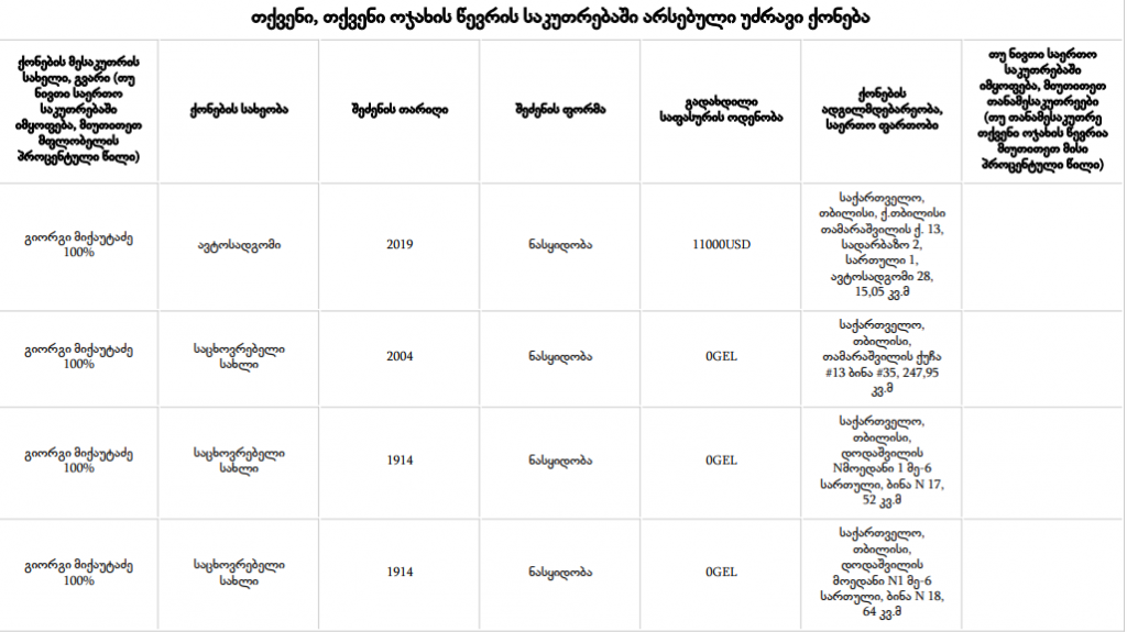 როგორც დეკლარაციაში მოცემული მიქაუტაძე ფლობს სამ საცხოვრებელ სახლს თბილისში, საბანკო ანგარიშებსა და ავტომანქანებს.