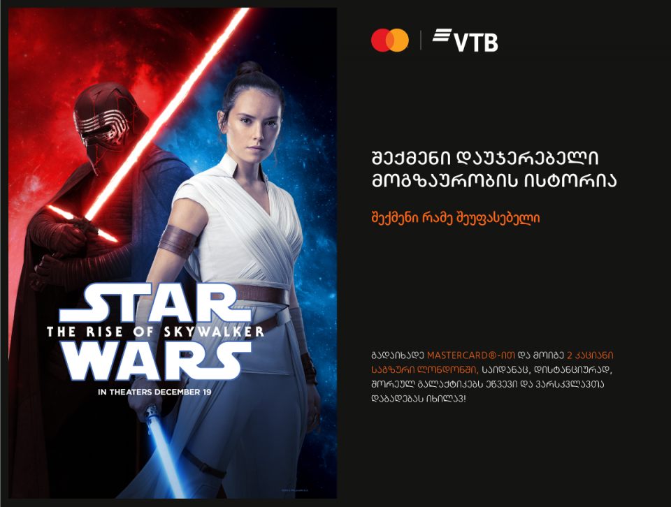 ვითიბი ბანკის Mastercard-ის ბარათების მფლობელებს შესაძლებლობა აქვთ ჩაერთონ Mastercard-ის წამახალისებელ გათამაშებაში. 31 დეკემბრის ჩათვლით, ვითიბი ბანკის ნებისმიეირი Mastercard-ის ბარათით გადახდისას, შესაძლებელია 750 – დან ერთი-ერთი საჩუქრის მოგება, ხოლო მთავრი პრიზი არის საგზური ლონდონში “Star Wars: The Rise of Skywalker”-ის საპრემიერო ჩვენებაზე დასასწრებად.