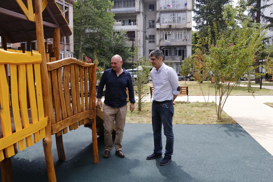 დასრულებული სკვერი საბურთალოს რაიონის გამგებელმა გაიოზ ვასაძემ, საკრებულოს მაჟორიტარ დეპუტატ დავით უთმელიძესთან ერთად დაათვალიერა.