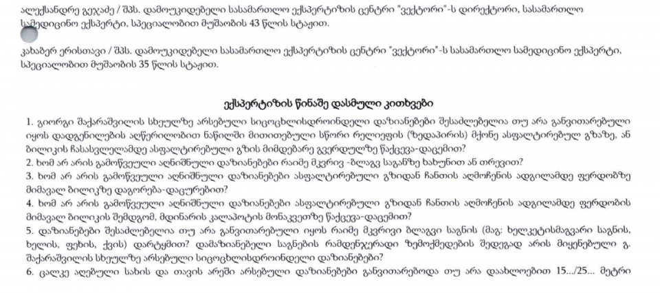 რაც შეეხება ექსპერტების წინაშე დასმულ კითხვებს, გამოძიება კონკრეტულად დაინტერესდა, რა ვითარებაში შეეძლო მიეღო დაზიანებები გიორგი შაქარაშვილს.