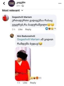 ნინი ბადურაშვილმა კომენტარებში საპასუხოდ გოგონას საკუთარი სურათი დაუდო და გარეგნობაზე მიუთითა: „ამ ვიდით რამდენს ბედავ!”.