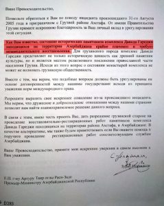 აზერბაიჯანელი კოლეგისთვის გაგზავნილ ოფიციალურ წერილში მაშინდელი პრემიერი ზურაბ ნოღაიდელი დავით გარეჯს აზერბაიჯანის ტერიტორიაზე მდებარე ძეგლად მოიხსენიებს, რომელიც რესტავრაციას საჭიროებს.