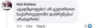 მთავარი ციტატა„ავადმყოფები! არ გეღირსოთ საქართველოში დაბრუნება“ – ქეთი დოლიძე ემიგრანტებს 13/10/202015/10/2020 0„ავადმყოფები! არ გეღირსოთ საქართველოში დაბრუნება! არასდროს!“ქეთი დოლიძე, რეჟისორიაღნიშნული კომენტარი დოლიძე ათენში, საქართველოს ექს-პრეზიდენტთან შეხვედრაზე მისულ ემიგრანტებს სოციალური ქსელის მომხმარებლის პოსტზე დაუწერა