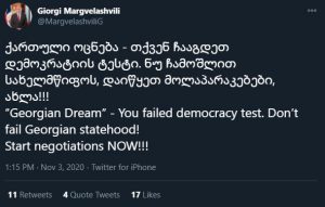 “ქართული ოცნება – თქვენ ჩააგდეთ დემოკრატიის ტესტი. ნუ ჩამოშლით სახელმწიფოს, დაიწყეთ მოლაპარაკებები, ახლა!!!”,-წერს მარგველაშვილი.