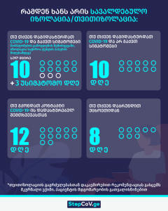 თუ გქონდათ კონტაქტი Covid-19-ის დადასტურებულ შემთხვევასთან იზოლაციაში/თვითიზოლაციაში ყოფნა სავალდებულოა 12 დღის განმავლობაში.