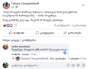 “ტაბულას” დამფუძნებელი, თამარ ჩერგოლეიშვილი “ფეისბუქის” საკუთარ გვერდზე, “ნაციონალური მოძრაობის” წევრის, თინა ბოკუჩავას ციტატას აქვეყნებს: