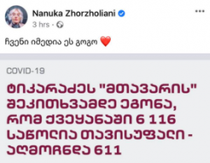 ახალი ამბები მთავარი“ჩვენი იმედია ეს გოგო” – ნანუკა ჟორჟოლიანი ეკატერინე ტიკარაძეზე 02/12/202002/12/2020 0ჟურნალისტი ნანუკა ჟორჟოლიანი სოციალურ ქსელში ჯანდაცვის მინისტრის ეკატერინე ტიკარაძის შესახებ პოსტს აქვეყნებს: