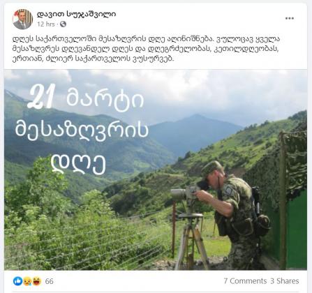ცნობისთვის, ცოტა ხნის წინ თავდაცვის მინისტრის მოადგილის “ფეისბუქის” საკუთარ გვერდზე გავრცელდა მესაზღვრეებს პროფესიული დღისადმი მილოცვის ტექსტი, რომელსაც თან ჰქონდა რუსი ჯარის კაცის ფოტო დართული. გამოქვეყნებული მილოცვა დავით სუჯაშვილის პირადი გვერდიდან მალევე წაიშალა, თუმცა მედიასაშუალებების მხრიდან მისი დასქრინვა მაინც მოესწრო.