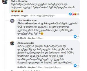 სამხარაძეს გაზიარებული აქვს სირცხვილიას პოსტი ბათუმის ორგანიზაციაში ოცნების აქტივისტების მისვლაზე, კომენტარში კი აქტივისტ გიგა მაქარაშვილზე წერს: “არავინ ჩალიჩობს, რამე მიაკეროს! ФСБ-ს ნომრიანი აგენტია! მაგარ სურპრიზს ვუმზადებთ! მისივე დანაბოლები ლაწირაკები დაუწყებენ გინებას”.