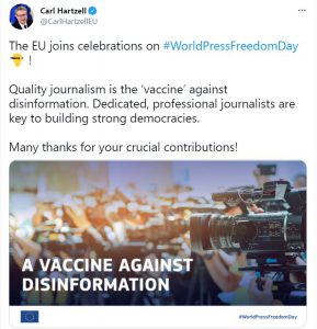 საქართველოში ევროკავშირის ელჩი, კარლ ჰარცელი პრესის თავისუფლების მსოფლიო დღეს გამოეხმაურა და აღნიშნა, რომ “ხარისხიანი ჟურნალისტიკა არის ვაქცინა დეზინფორმაციის წინააღმდეგ”.
