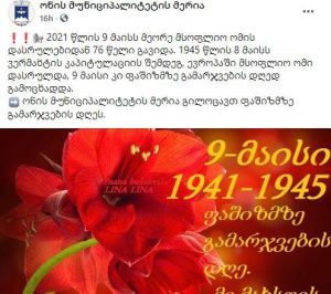 “2021 წლის 9 მაისს მეორე მსოფლიო ომის დასრულებიდან 76 წელი გავიდა. 1945 წლის 8 მაისს ვერმახტის კაპიტულაციის შემდეგ, ევროპაში მსოფლიო ომი დასრულდა, 9 მაისი კი ფაშიზმზე გამარჯვების დღედ გამოცხადდა”, – ვკითხულობთ ონის მუნიციპალიტეტის მერიის მიერ გავრცელებულ ფეისბუქ პოსტში, რომელსაც თან ფოტოსურათს ურთავს.