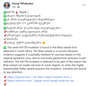 საზოგადოებრივი ჯანდაცვის ექსპერტი, გიორგი ფხაკაძე სოციალურ ქსელში პოსტს აქვეყნებს და წერს, რომ არსებობს კიდევ ერთი ახალი შტამი ნეპალიდან.