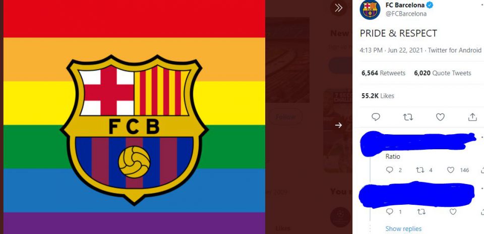 ახალი ამბები მთავარი საზოგადოებაბარსელონამ Twitter-ზე კლუბის ლოგო LGBT დროშის ფონზე გამოაქვეყნა 23/06/2021 0ბარსელონას ოფიციალურმა გვერდმა Twitter-ზე კლუბის ლოგო LGBT დროშის ფონზე გამოაქვეყნა.