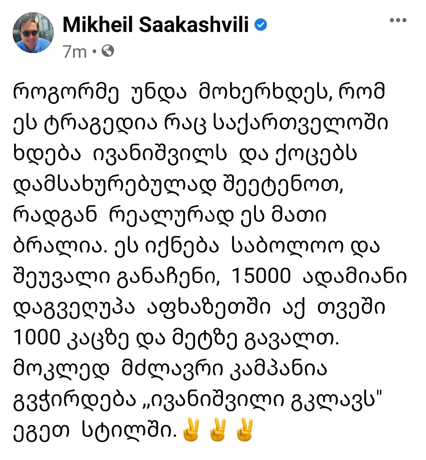 [su_quote] როგორმე უნდა მოხერხდეს, რომ ეს ტრაგედია რაც საქართველოში ხდება ივანიშვილს და ქოცებს დამსახურებულად შეეტენოთ, რადგან რეალურად ეს მათი ბრალია. ეს იქნება საბოლოო და შეუვალი განაჩენი, 15000 ადამიანი დაგვეღუპა აფხაზეთში აქ თვეში 1000 კაცზე და მეტზე გავალთ. მოკლედ მძლავრი კამპანია გვჭირდება “ივანიშვილი გკლავს” ეგეთ სტილში. [/su_quote]
