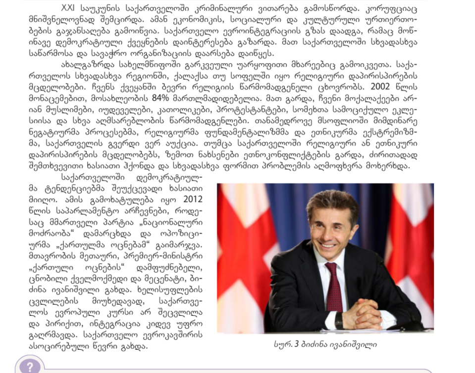 “[2012 წელს] მთავრობის მეთაური, პრემიერ-მინისტრი ქართული ოცნების დამფუძნებელი, ცნობილი ქველმოქმედი და მეცენატი, ბიძინა ივანიშვილი გახდა. ხელისუფლების ცვლილების მიუხედავად, საქართველოს ევროპული კურსი არ შეცვლილა და პირიქით, ინტეგრაცია კიდევ უფრო გაღრმავდა (გვერდი 410)”, – აღნიშნულია სახელმძღვანელოში.