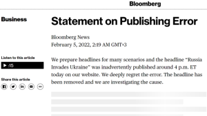 “სათაურებს მრავალი სცენარის მიხედვით ვამზადებთ და მასალა ჰედლაინით “რუსეთი უკრაინაში შეიჭრა” დაუდევრობის გამო გამოქვეყნდა ჩვენს ვებ-გვერდზე. ძალიან ვწუხვართ ამ შეცდომისთვის. სათაური წაშლილია და მომხდარის მიზეზს ვიკვლევთ”, – განმარტეს “ბლუმბერგში”.