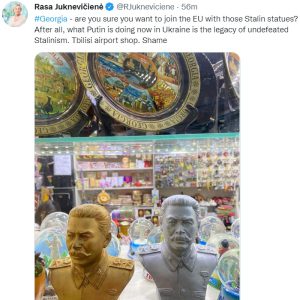 “საქართველო, დარწმუნებული ხარ, რომ სტალინის ამ სკულპტურებით გინდა ევროკავშირში შესვლა? ის, რასაც ახლა პუტინი უკრაინაში აკეთებს, ხომ სწორედ “დაუმარცხებელი სტალინიზმის” მემკვიდრეობაა. ეს თბილისის აეროპორტის მაღაზიაშია. სირცხვილია”, – წერს იუკნევიჩიენე.