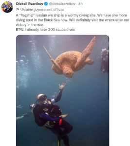 [su_quote]რუსული სამხედრო გემების ფლაგმანის, “მოსკოვის” ჩაძირვის შემდეგ დაივინგისთვის კიდევ ერთი კარგი ადგილი გამოგვიჩნდა შავ ზღვაში. აუცილებლად ვესტუმრები ომში ჩვენი გამარჯვების შემდეგ[/su_quote]