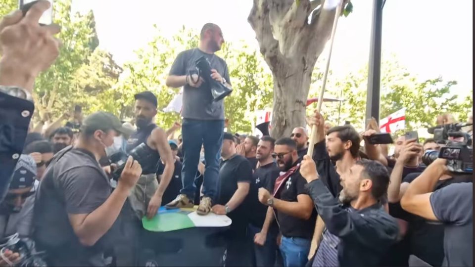 ძალადობრივი დაჯგუფების წევრები მსვლელობით EU-ს ოფისთან მივიდნენ და საქართველოს დროშა გაშალეს.