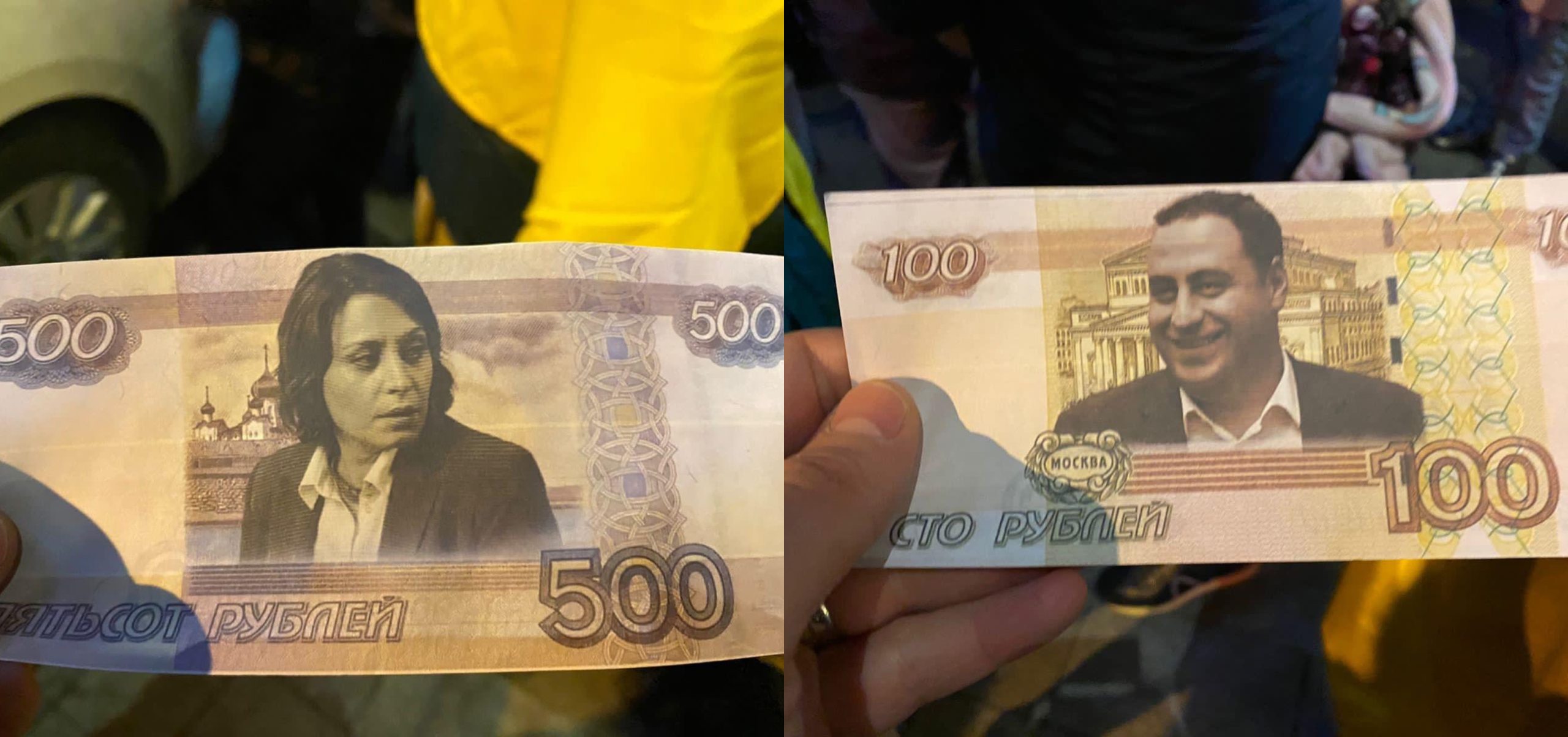 რუსთაველზე დრონმა ჩამოყარა რუსული რუბლის კუპიურები რომელზეც ელენე ხოშტარია და გიორგი ვაშაძე არიან გამოსხულები