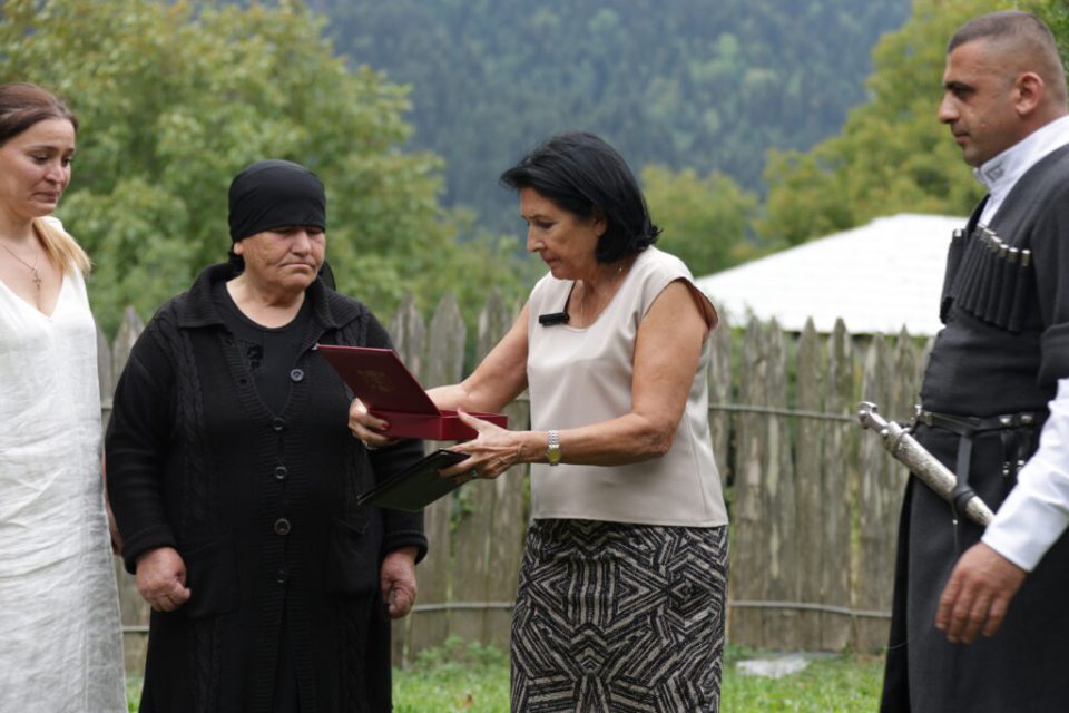 ძალიან მიხარია, რომ დღეს აქ პატარებიც არიან, რადგან პატარებისთვის გვჭირდება ასეთი მაგალითები. გაიზრდებით და ეს დღე არასოდეს დაგავიწყდებათ- თქვენ გეცოდინებათ, რომ ცხოვრებაში არაფერია იმაზე მნიშვნელოვანი და ძვირფასი, ვიდრე შენი ქვეყნის დაფასება, ესაა ძვირფასი – და არა ფული, წარმატება და ძალაუფლება. ეს ჯილდო არა ჩემი პირადი, არამედ მთელი ქვეყნის დაფასებაა თქვენი შვილისთვის, საქართველოს შვილისთვის. ამისთვის ძალიან დიდი მადლობა“, – განაცხადა საქართველოს პრეზიდენტმა.