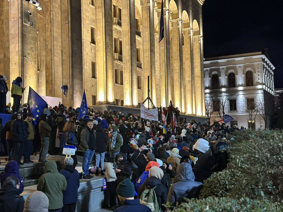 მომიტინგეები პარლამენტის შენობასთან განთავსებულ რკინის ჯებირებზე აბრახუნებენ, რითაც პროტესტს გამოხატავენ. ისინი „ქართული ოცნების“ მიერ ევროკავშირში გაწევრიანების პროცესის 2028 წლამდე შეჩერებას აპროტესტებენ.