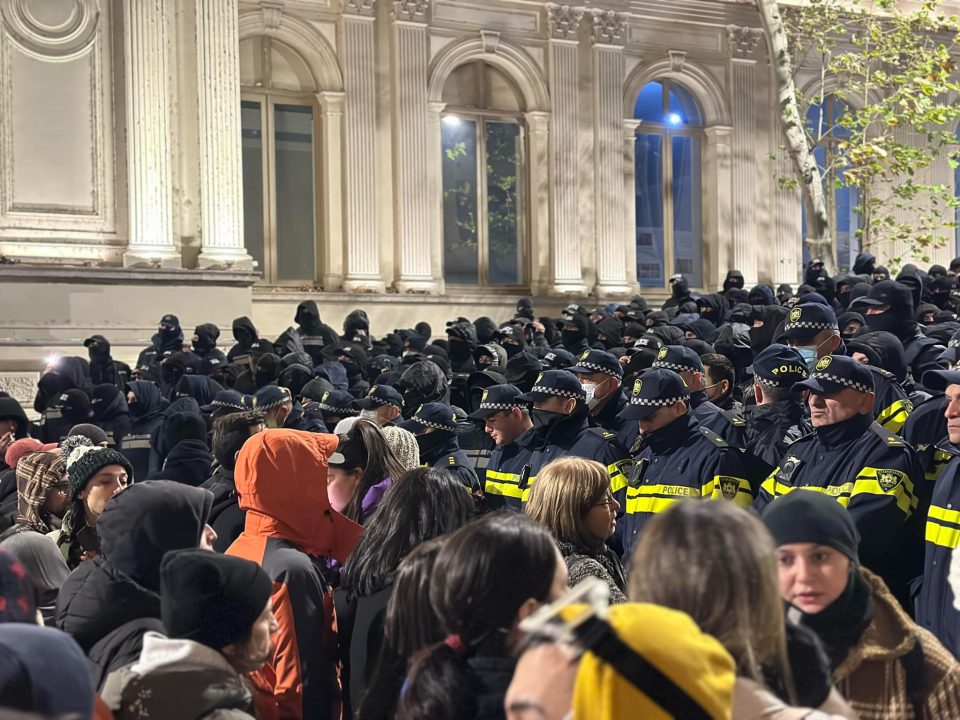 “გვსურს, საზოგადოებას მივაწოდოთ ინფორმაცია, მიმდინარე წლის 1-2 დეკემბერს რუსთაველის გამზირზე, პარლამენტის მიმდებარე ტერიტორიაზე განვითარებული მოვლენების შესახებ.აქციის მონაწილეების მხრიდან განხორციელებული კანონსაწინააღმდეგო და ძალადობრივი ქმედებების შედეგად, გასულ ღამეს ჯანმრთელობის დაზიანება მიიღო შინაგან საქმეთა სამინისტროს 21-მა თანამშრომელმა. დაშავებულების ნაწილს აღენიშნება მძიმე ხარისხის დაზიანებები თავის, სახისა და სხეულის სხვადასხვა მიდამოში.ბოლო პერიოდში მიმდინარე აქციების განმავლობაში ჯანმრთელობის დაზიანება ჯამში შინაგან საქმეთა სამინისტროს 113-მა თანამშრომელმა მიიღო, მათგან 4 ამ დრომდე სამედიცინო დაწესებულებაში რჩება.მსგავსად წინა დღეებისა მიუხედავად არაერთგზის გაფრთხილებისა, აქციის მიმდინარეობის დროს, აქციის მონაწილეთა ნაწილის მხრიდან არაერთხელ ჰქონდა ადგილი პროვოკაციულ ქმედებებს.საზოგადოება თვალს ადევნებდა მოძალადე ჯგუფები როგორ აზიანებდნენ პარლამენტის შენობას და რუსთაველის გამზირზე განთავსებულ ინფრასტრუქტურას.გვიან ღამით აქციის მონაწილეებმა რუსთაველის გამზირზე არსებული მუნიციპალური ქონება და კერძო პირთა საკუთრება დააზიანეს, დაზიანებული ნივთების მეშვეობით აღმართეს ბარიკადები და ცეცხლი წაუკიდეს გარკვეულ ნივთებს.გვსურს საზოგადოების ინფორმირების მიზნით განვმარტოთ, რომ შინაგან საქმეთა სამინისტროში, მიმდინარე აქციების ფარგლებში, ძალადობრივი ჯგუფების მხრიდან ჩადენილ ყველა დანაშაულებრივ ქმედებაზე გამოძიება სისხლის სამართლის კოდექსის 187-ე და 353-ე პრიმა მუხლებით მიმდინარეობს.გამოძიების ფარგლებში, შინაგან საქმეთა სამინისტროს თბილისის პოლიციის დეპარტამენტის თანამშრომლებმა, ჩატარებული ოპერატიული ღონისძიებებისა და საგამოძიებო მოქმედებების შედეგად, სამსახურებრივი საქმიანობის შესრულების დროს პოლიციელებზე თავდასხმისა და ცეცხლის წაკიდებით ნივთის დაზიანების ბრალდებით ორი პირი: 2007 წელს დაბადებული მ.გ. და წარსულში მრავალჯერ ნასამართლევი – 2003 წელს დაბადებული გ.მ. დააკავეს.დანაშაულები 7 წლამდე ვადით თავისუფლების აღკვეთას ითვალისწინებს.გამოძიებით დადგინდა, რომ მიმდინარე წლის 29 ნოემბერს, რუსთაველის გამზირზე გამართული აქციის დროს 9 აპრილის ქუჩაზე, ბრალდებულმა გ.მ.-მ პიროტექნიკის სროლის შედეგად სხეულის სხვადასხვა არეში დაზიანება მიაყენა შინაგან საქმეთა სამინისტროს თანამშრომელს, რომელსაც შესაბამისი სამედიცინო დახმარება გაეწია. ხოლო, მ.გ.-მ იმავე დღეს, საკანონმდებლო ორგანოს შე