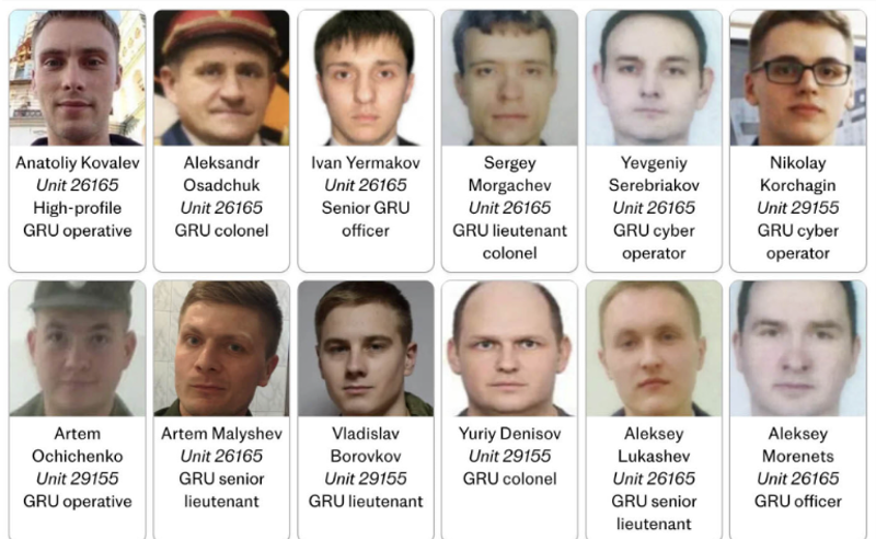 სანქცირებულები არიან: GRU-ს ხელმძღვანელი პირები: დიმიტრი მიხაილოვი, ალექსეი მორენეცი, სერგეი მორგაჩოვი, ვიქტორ ნეტიკშო, ევგენი სერებრიაკოვი, იური შიკოლენკო.