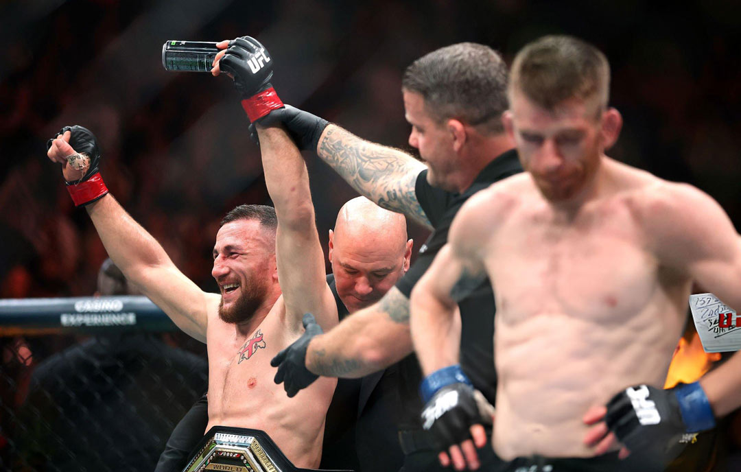 ქართველმა მებრძოლმა, მერაბ დვალიშვილმა კორი სენდჰეგენი დაამარცხა და UFC-ს საჩემპიონო ქამარი შეინარჩუნა – 34 წლის დვალიშვილმა სუპერმსუბუქ დივიზიონში ალჯამეინ სტერლინგის რეკორდი გაიმეორა, მან თავისი ტიტული უკვე სამჯერ დაიცვა.