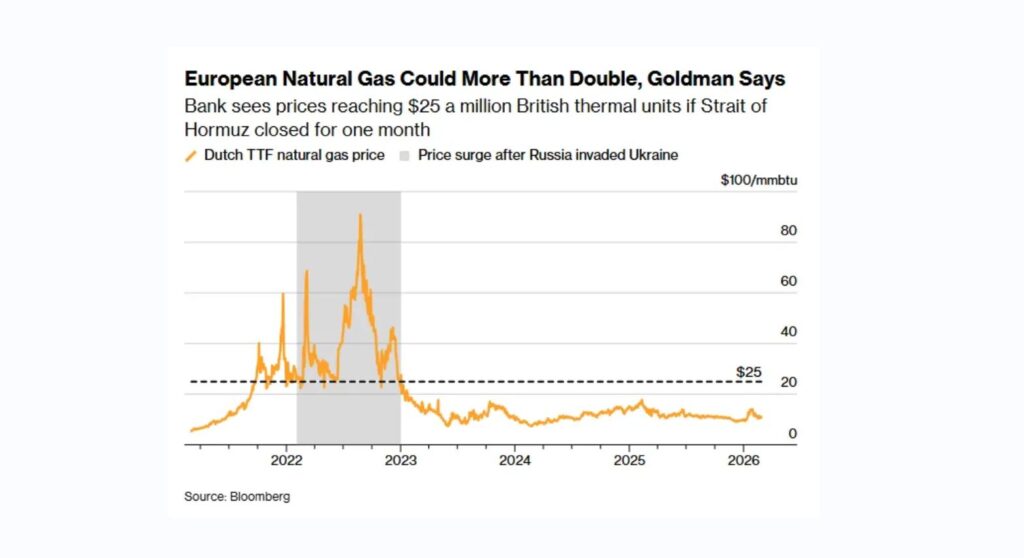 კომპანიის ანალიტიკოსების ვარაუდით, ბუნებრივი აირის ფასები ევროპაში შეიძლება, გაორმაგდეს, თუ ჰორმუზის სრუტის გავლით გადაზიდვები, სულ მცირე, ერთი თვით შეჩერდება.